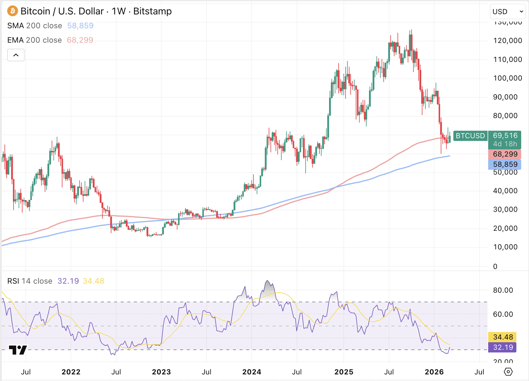 Le cours du Bitcoin subit aujourd’hui une légère pression, ayant baissé de 0,58 % par rapport à il y a 24 heures. Cela place Bitcoin au niveau de 69 500 dollars. Bitcoin se maintient toujours au-dessus de la moyenne exponentielle de 200 semaines (ligne rouge) et à peu près au sommet historique de 2021. Une clôture hebdomadaire au-dessus de la ligne rouge serait historiquement un signal encourageant.