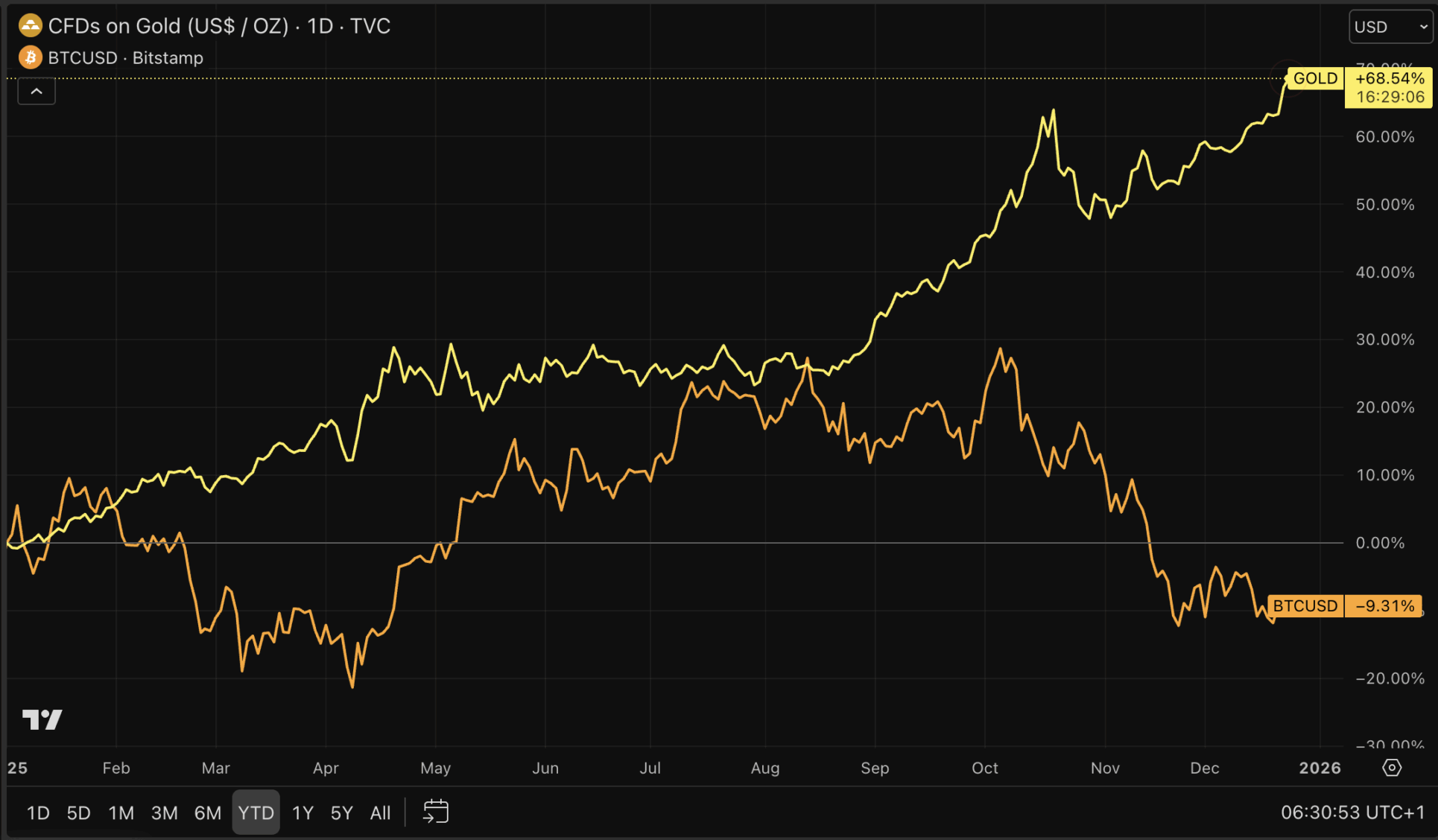 Pour l’instant, Bitcoin ne parvient pas à se remettre de la mauvaise période. Ces dernières 24 heures, nous avons observé une baisse de près de 1 % du cours, qui a atteint son niveau actuel de 87 950 dollars. Cela montre que les performances de Bitcoin restent instables, tandis que le cours de l’or atteint de nouveaux records. Pourquoi Bitcoin ne parvient-il pas à suivre l’or ?