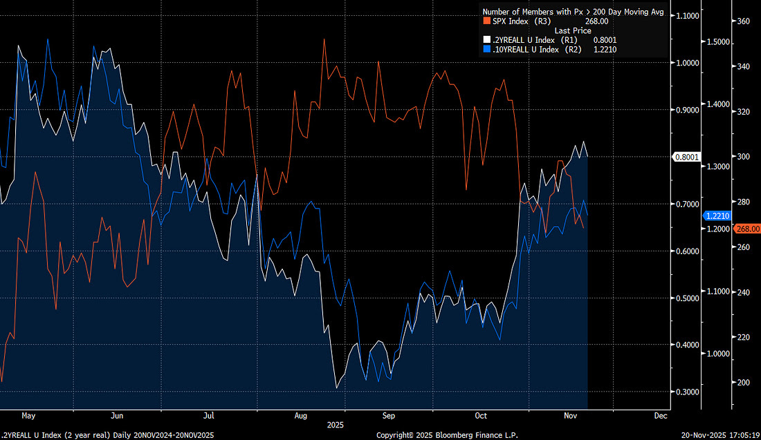 Depuis lors, les actifs risqués sont sous pression. La chute du S&P 500 (orange, graphique ci-dessous) a commencé au moment où les taux réels ont grimpé (blanc et bleu).