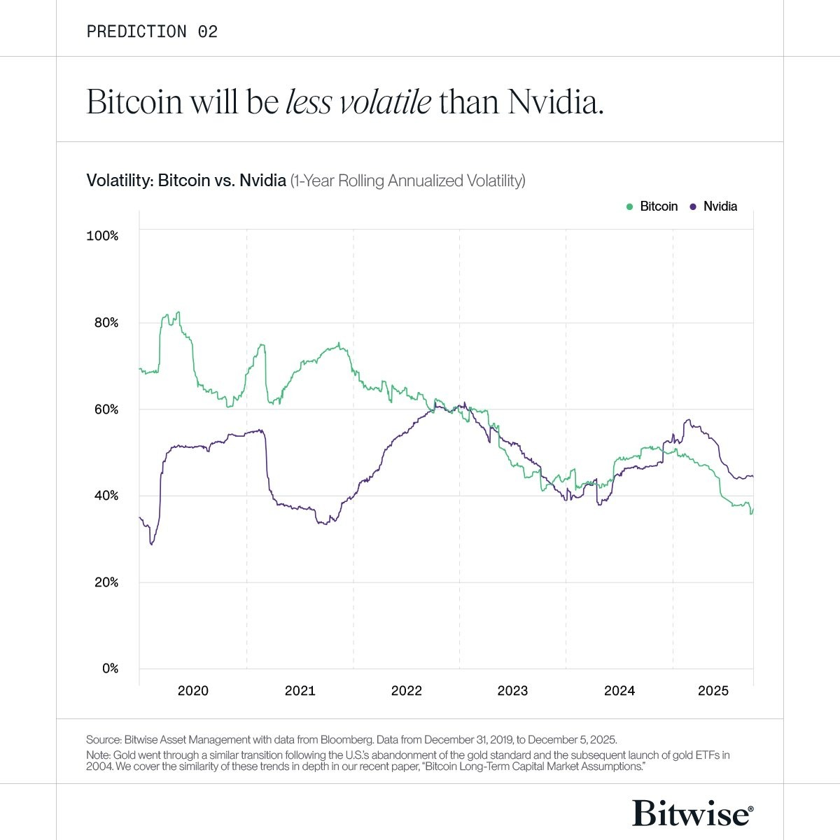Bitwise prévoit que cette tendance se poursuivra. En 2026 également, Bitcoin devrait, selon l’entreprise, rester moins volatil que de nombreuses grandes actions technologiques.
