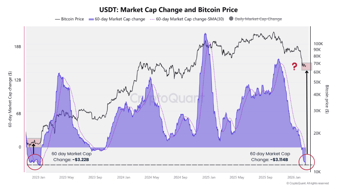 La capitalisation de Tether (USDT) a diminué de plus de 3,1 milliards de dollars en soixante jours. Selon l’analyste Moreno, qui s’appuie sur des données de CryptoQuant, ce phénomène est rare.