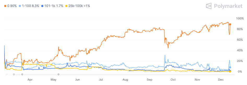 Sur la plateforme de prévisions Polymarket, on spécule déjà beaucoup sur la vente des Trump Gold Cards. Selon les prévisions actuelles, il y a 72 % de chances qu’aucune carte ne soit vendue cette année. Dix-huit pour cent des participants estiment qu’entre 1 et 100 cartes seront émises. Les probabilités diminuent rapidement : 7 % voient une vente comprise entre 100 et 1 000 unités, et seulement 1 % pensent qu’il est possible que 100 000 ou plus soient vendues.