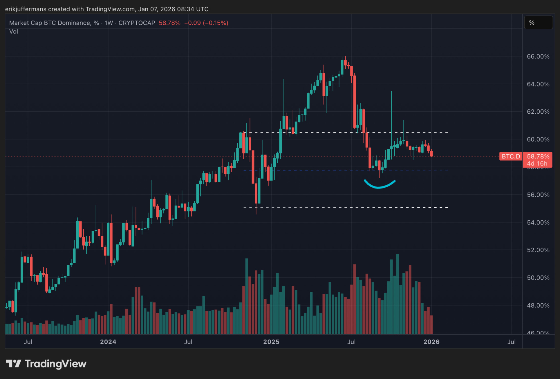 Le premier graphique que nous examinons est celui de la dominance du Bitcoin (BTC.D). Ce graphique montre la part de Bitcoin par rapport à l’ensemble du marché des cryptomonnaies. Si la dominance du BTC augmente, cela signifie que les altcoins sous-performent par rapport au BTC et baissent souvent. À l’inverse, une baisse de la dominance du BTC est souvent associée à de fortes hausses des altcoins.