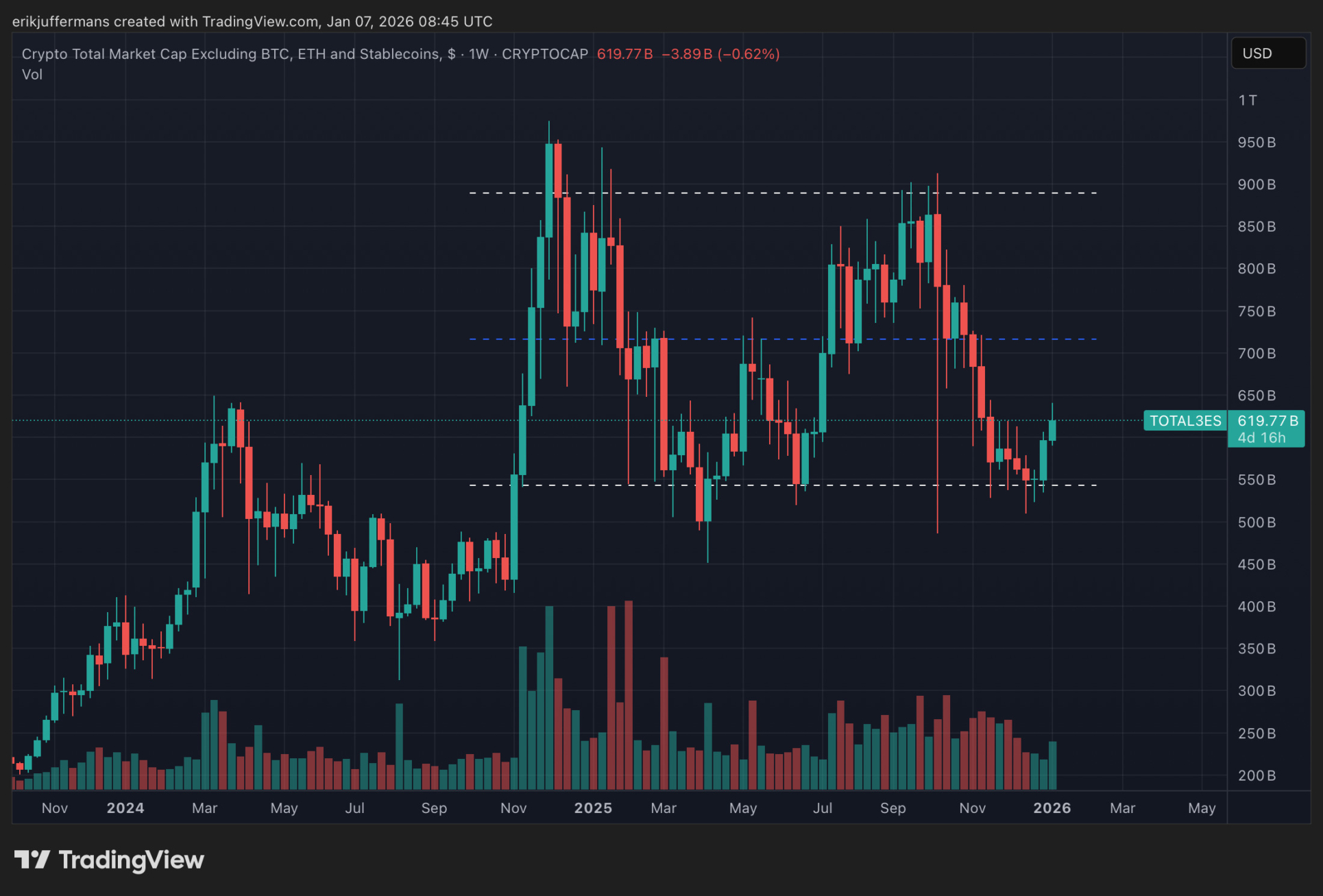 Nous constatons que le graphique a trouvé un support ces dernières semaines autour de 550 milliards de dollars. Un niveau qui s’est avéré être une zone de soutien forte en 2025. TOTAL3ES semble ainsi en route vers le milieu du canal, autour de 700 milliards de dollars.
