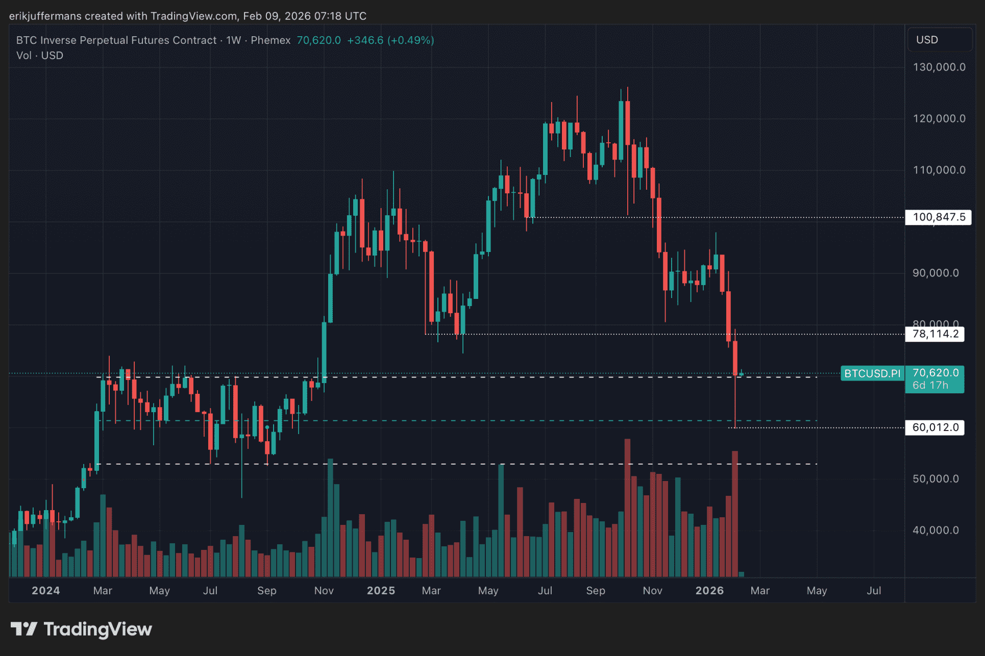 D’après Erik Juffermans, cela augmente la probabilité que cette zone finisse par servir de plancher macroéconomique. Cependant, ce processus pourrait être long. Une période prolongée de consolidation est probable, avec des mouvements brusques sur des cadrans temporels plus courts restant possibles. Pour un redressement structurel, il est crucial que les bougies hebdomadaires continuent de clôturer au-dessus de 69 000 dollars.