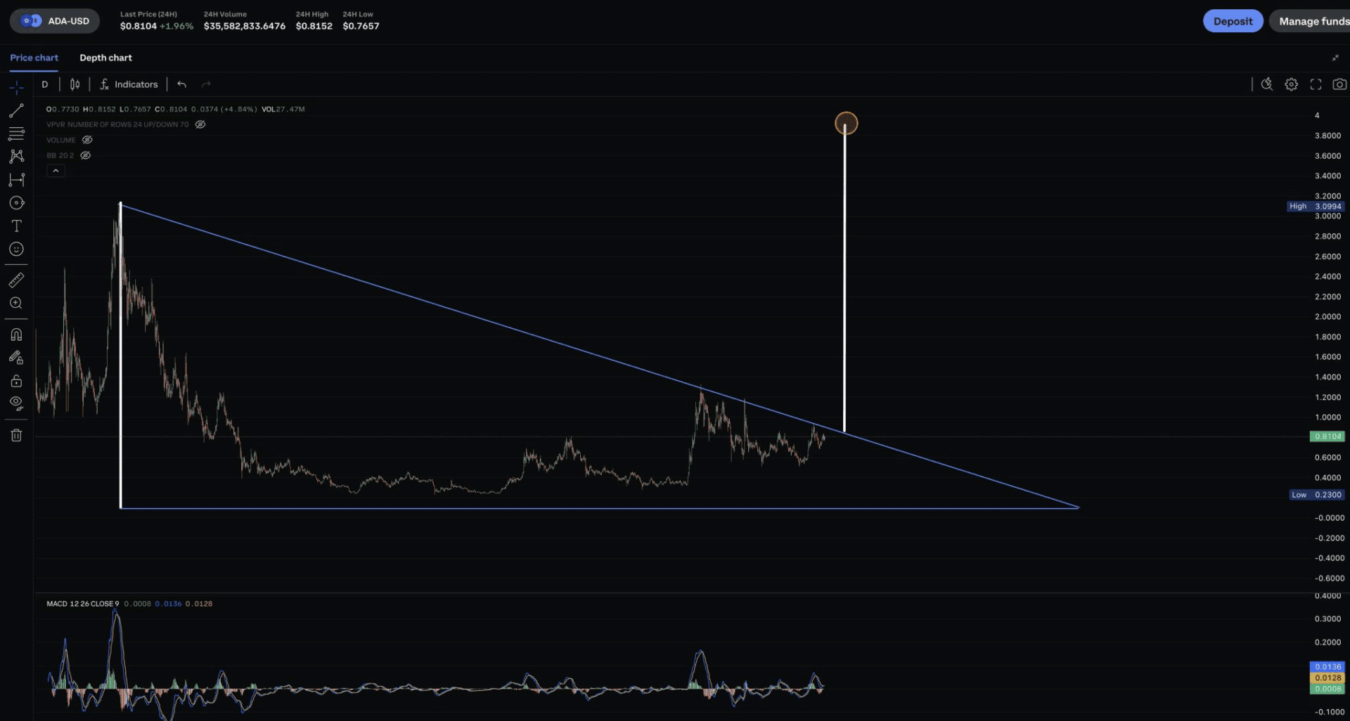 Pourtant, ADA reste encore bien en dessous de son pic : le jeton se situe environ 68 % en dessous de son prix record. Selon l’analyste crypto Christopher Visser, cela pourrait toutefois changer rapidement.