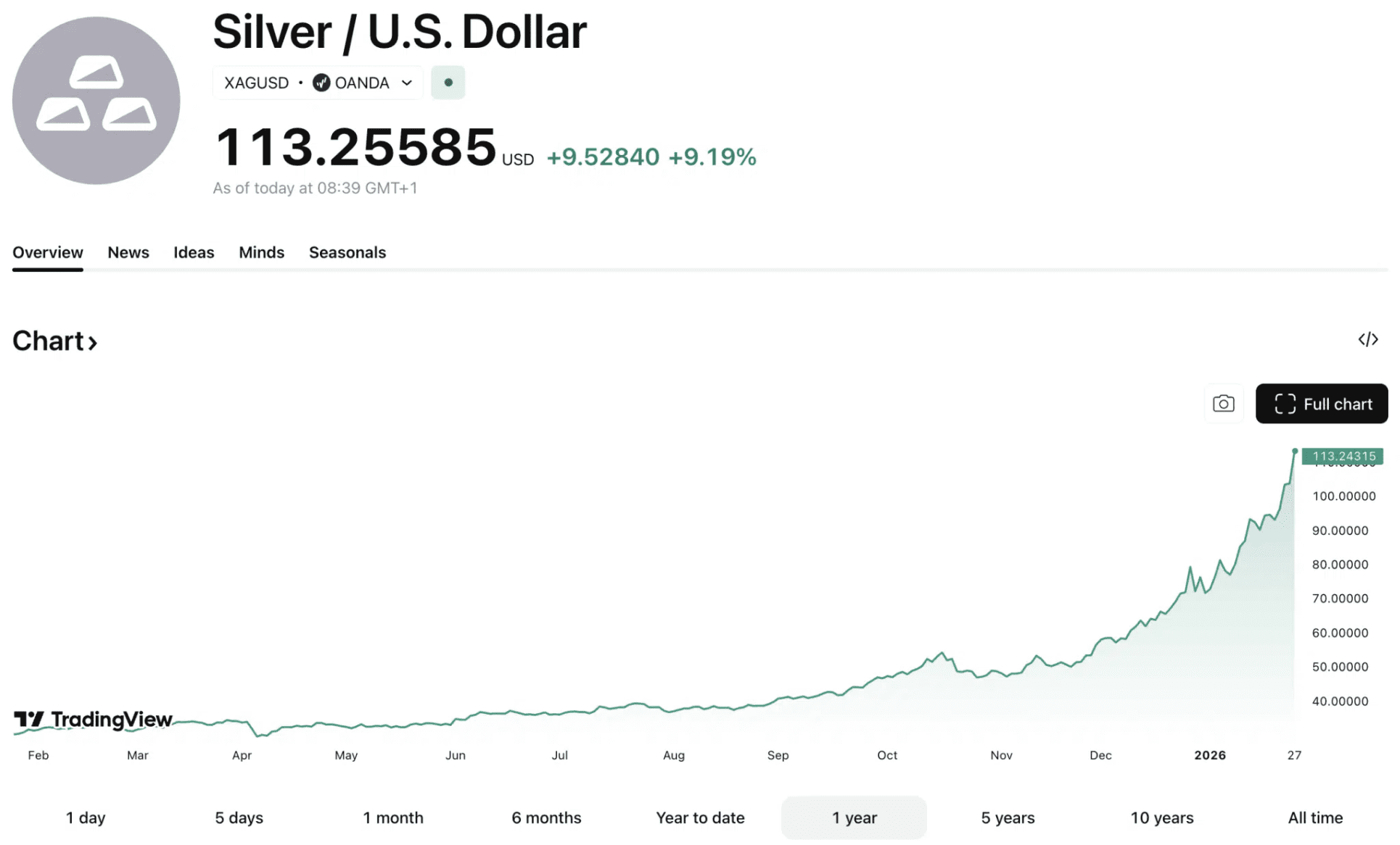 L’or et l’argent captent l’attention des investisseurs avec des hausses de prix historiques. Cette semaine, l’argent a franchi la barre des 110 dollars l’once, enregistrant une hausse de 262 % depuis début 2025. L’or a suivi avec un pic au-delà de 5 200 dollars, offrant un rendement annuel de plus de 17 %.