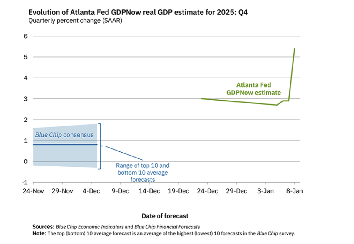 Selon le modèle GDPNow de la Fed d’Atlanta, la croissance économique atteindra 5,4 % au quatrième trimestre de 2025. Parallèlement, la productivité du travail a augmenté de 4,9 % en rythme annuel au troisième trimestre, tandis que le nombre d’heures travaillées a à peine augmenté. Autrement dit, les entreprises produisent beaucoup plus sans embaucher beaucoup de personnel supplémentaire.