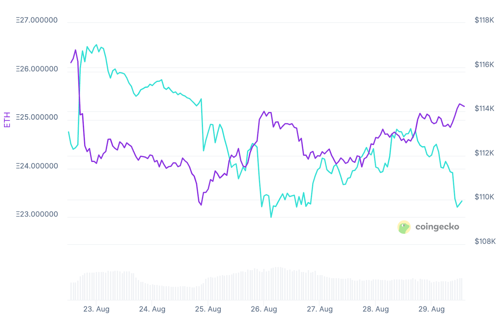 Graphique hebdomadaire du cours de Bitcoin (turquoise) et du ratio BTC/ETH (violet) – source : CoinGecko