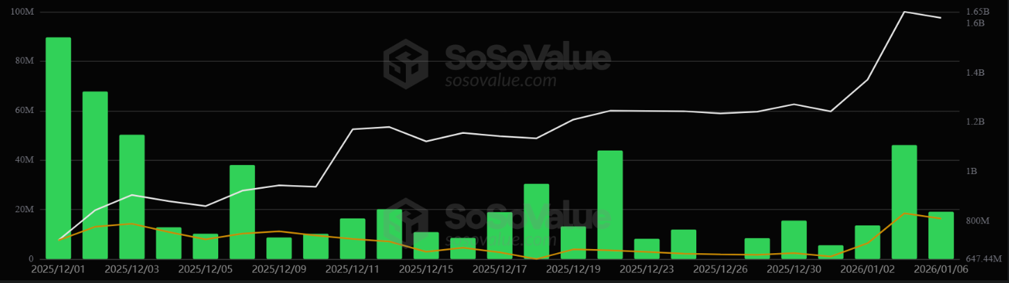 Bien que WisdomTree se retire, la situation générale pour le XRP reste solide. L’afflux constant dans les ETF XRP montre que de nombreux investisseurs gardent confiance dans ce marché. Cela a porté le total des actifs sous gestion des ETF XRP spot à environ 1,6 milliard de dollars.