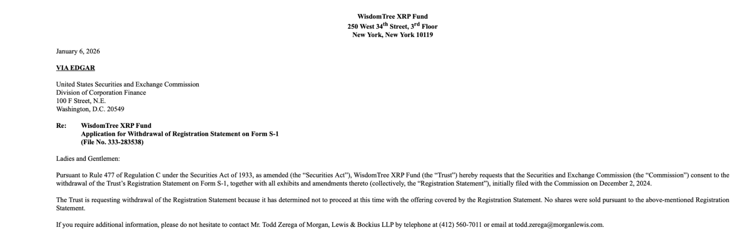Dans un dossier officiel, WisdomTree, qui gère actuellement plus de 138 milliards de dollars d’actifs, indique qu’il « ne souhaite pas poursuivre pour le moment » avec le projet d’ETF XRP. La demande, déposée en décembre 2024, a été entièrement retirée. Aucun titre ETF n’a été vendu.